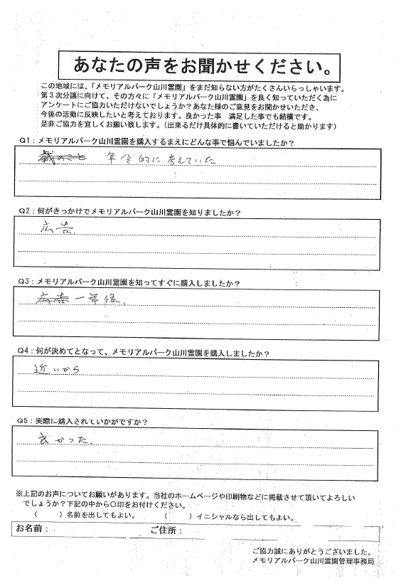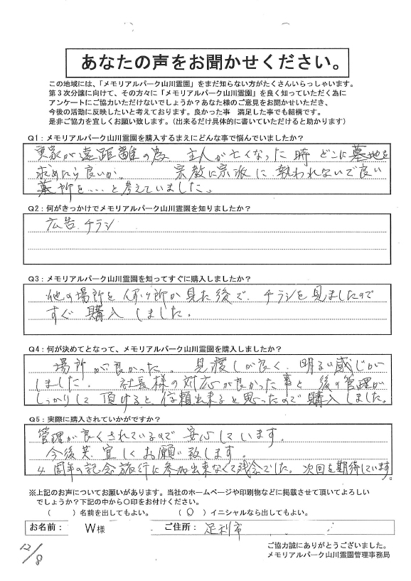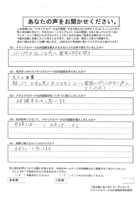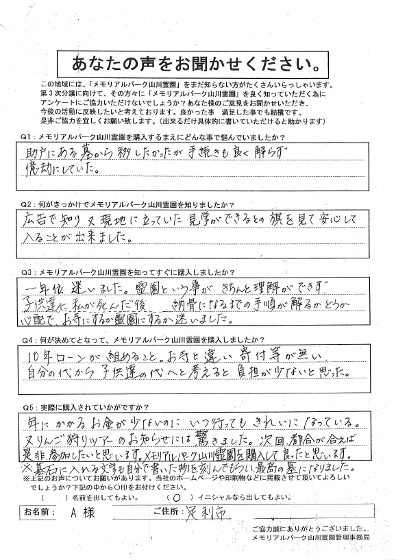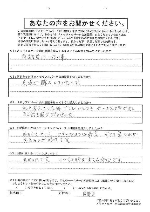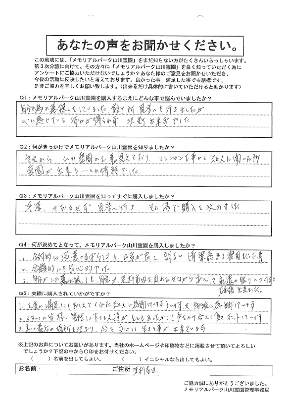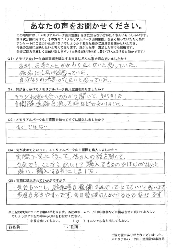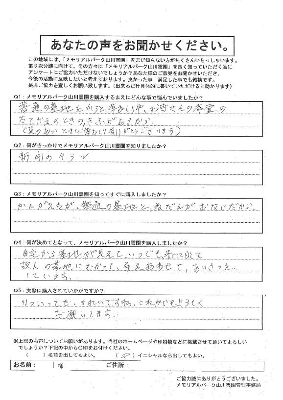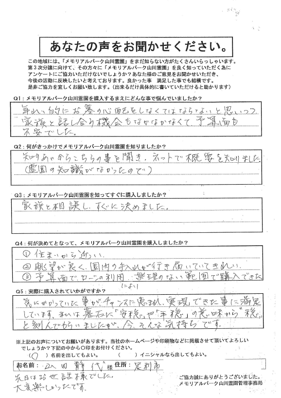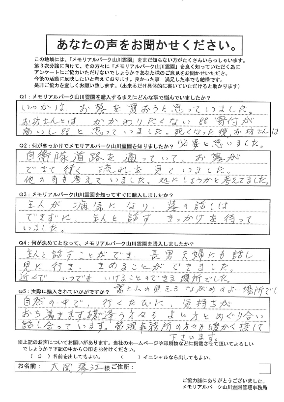 それから私は主人を想う気持ちでお墓を考えました。最初はとても難しくすごく悩み、あれこれ考え、お墓の本も読みました。考えすぎてわからなくなり友達が建てたお墓も見にいきました。でも原点に戻り、主人がいつも私の隣にいて私を見守っていてくれるように、私は主人が好きだった色、いつも感じていた事を思い選び、