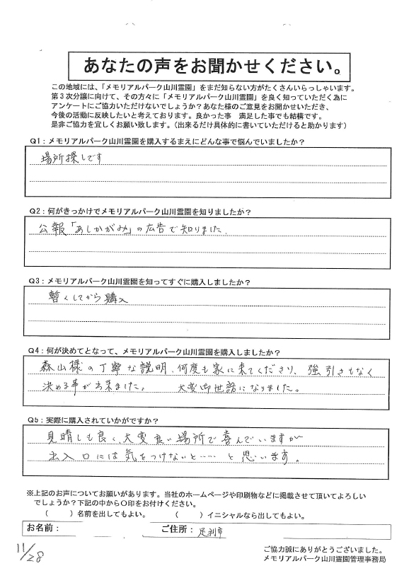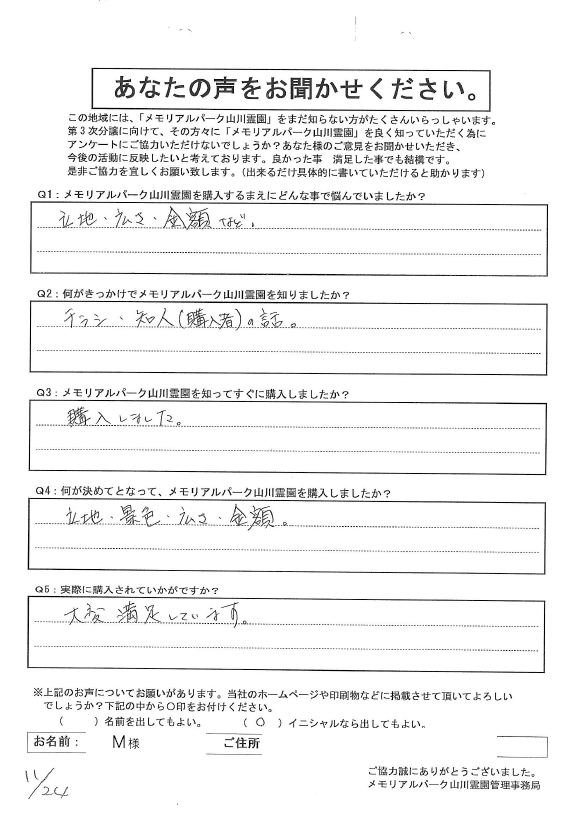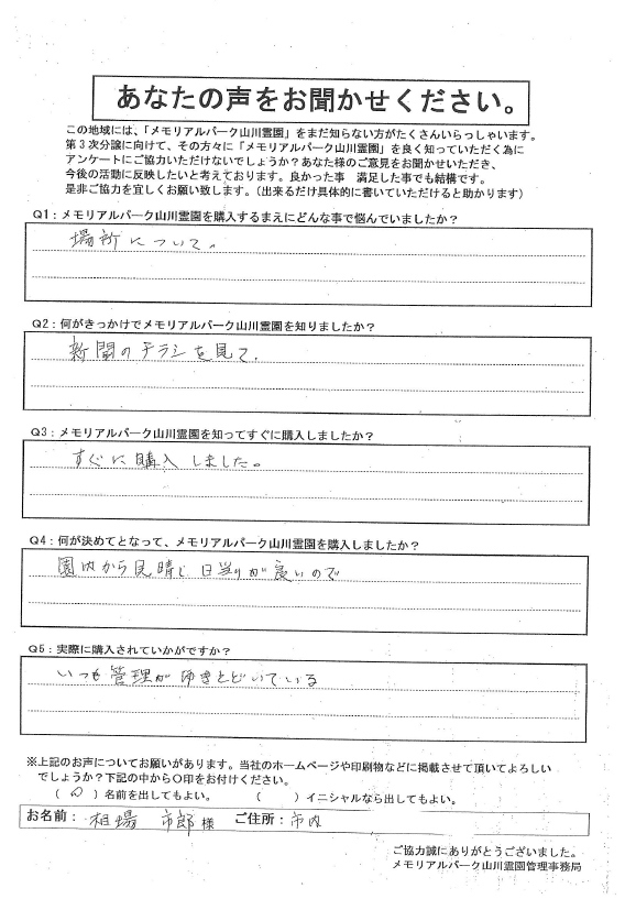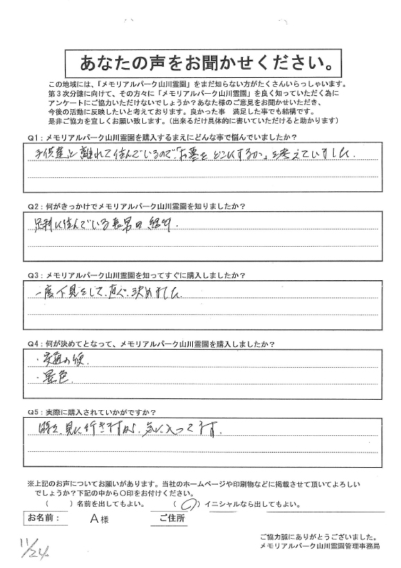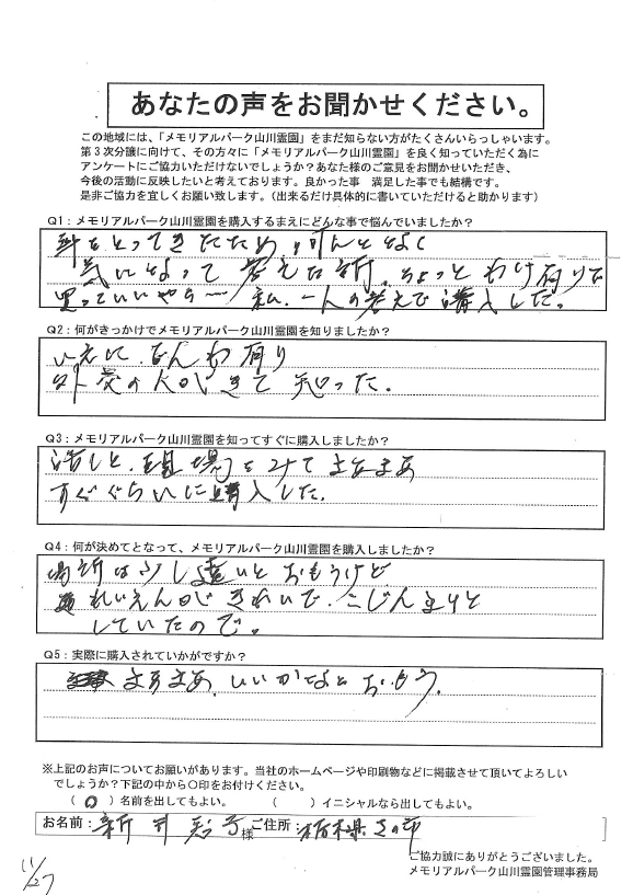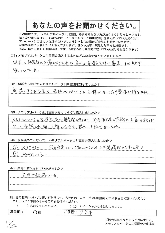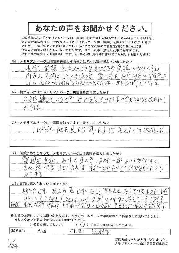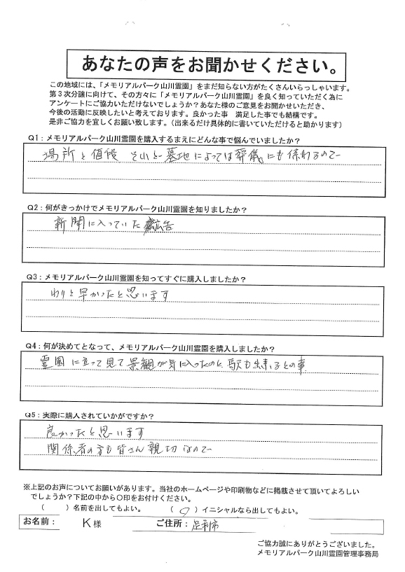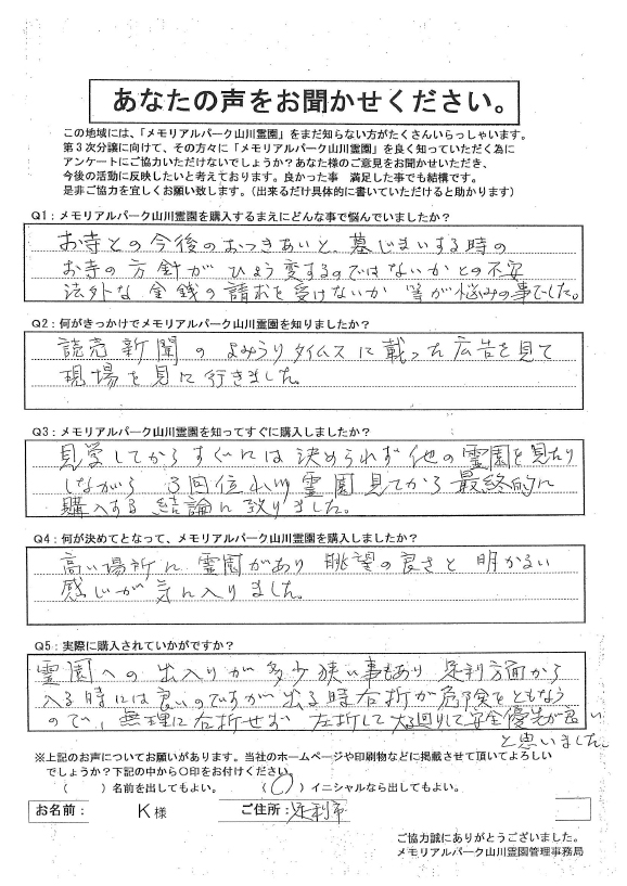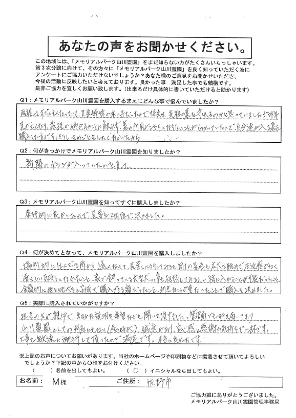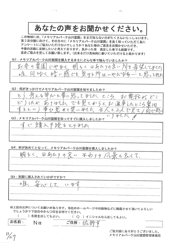 それから私は主人を想う気持ちでお墓を考えました。最初はとても難しくすごく悩み、あれこれ考え、お墓の本も読みました。考えすぎてわからなくなり友達が建てたお墓も見にいきました。でも原点に戻り、主人がいつも私の隣にいて私を見守っていてくれるように、私は主人が好きだった色、いつも感じていた事を思い選び、